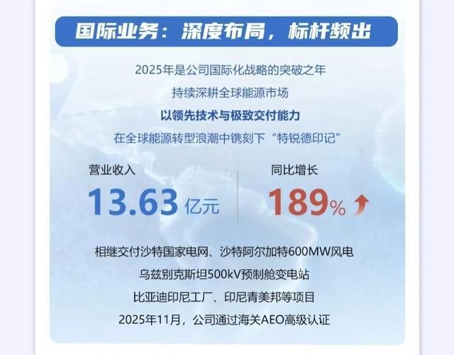 第一是海外持续放量。中东、东南亚、中亚的电网建设还在加速,特锐德已完成区域布局,分公司不断建立,2026年海外营收有望继续突破,同时这次港股要是上市成功,那突破的幅度会更大。