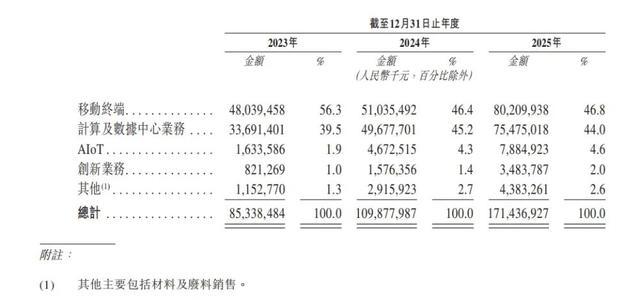 以2025年为例,其第一大收入来源为移动终端业务,其中包括了智能手机、平板电脑及智能穿戴设备,贡献了802亿元收入,占总营收的46.8%。营收占比位居第二的是计算及数据中心业务,主要包括笔记本电脑和服务器,收入达754.75亿元,占比44%。这两大核心业务合计贡献了超过90%的营收,构成了华勤技术营收的基本盘。